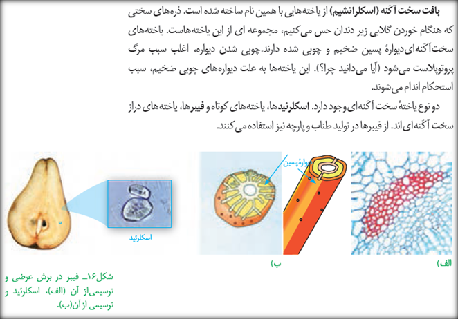 شكل 16 اين صفحه (قسمت الف)، برش عرضي از قسمتي از گياه را نشان ميدهد كه در آن رنگ قرمز نشان داده شده، ياختههاي فيبر هستند. با وجود اينكه ياختههاي فيبر مرده هستند (چون محتويات داخل ياختهاي خود را از دست دادهاند) ولي لاندار هستند. اين لانها به صورت منافذي نشان داده شده است. قسمت ب این شکل، يك ياخته اسكلرئيد را نشان ميدهد كه نسبت به ياخته فيبر، ديواره ياختهاي ضخيمتري داشته و با وجود غيرزنده بودن (محتويات داخل ياختهاياش از دست رفته است)، لاندار است. همچنين در اين شكل، ذرههاي سختي نشان داده شده است كه در بافت نرم ميوه گلابی، حضور دارند و زير دندانها بهتر حس ميشوند. اين ذرات، مجموعهاي از ياختههاي اسكلرئيدي هستند.